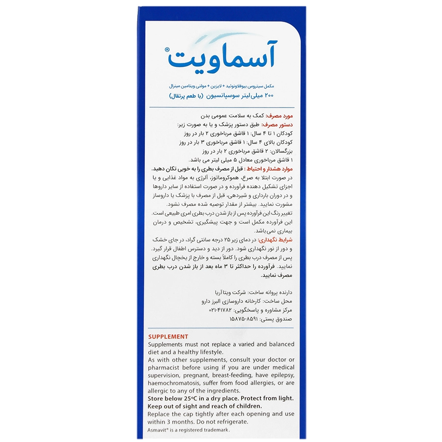 طعم شربت آسماویت پرتقالی است که برای بسیاری از کودکان مطلوب بوده و پذیرش بالایی دارد.