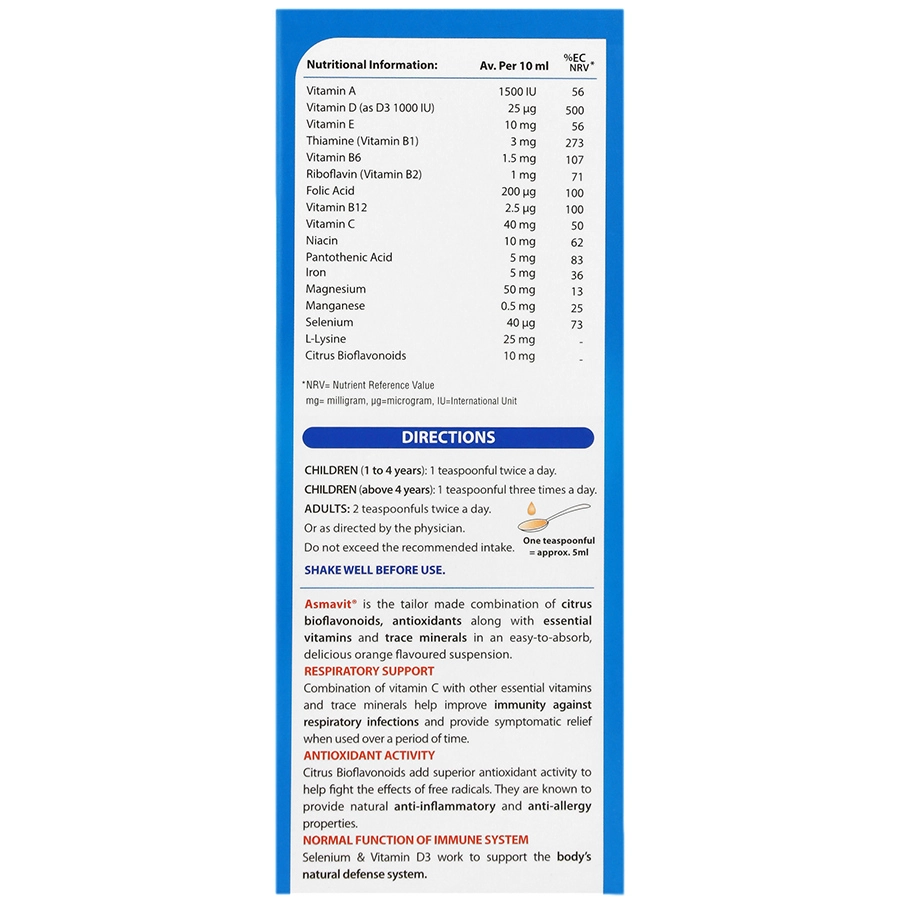 در کنار ویتامین ها و املاح ضروری، شربت آسماویت حاوی لیزین و بیوفلاونوئیدهای مرکباتی نیز می باشد. لیزین اسیدآمینه ضروری است که در ساخت پروتئین ها مخصوصا بافت همبند نقش کلیدی دارد. همچنین، سیستم ایمنی را تقویت می کند.