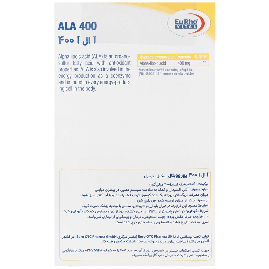 هر کپسول از آلفا لیپوئیک اسید یوروویتال حاوی 400 میلیگرم آلفالیپوئیک اسید است.