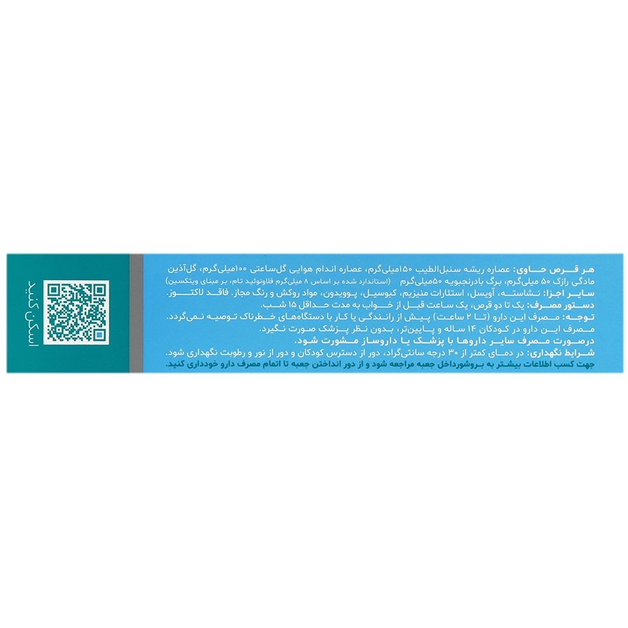مطالعاتی در ارتباط با ایمنی استفاده از فرآوردههای حاوی سنبل الطیب و گل ساعتی در 8 هفته وجود دارد. بیخطر بودن استفاده از فرآوردههای حاوی بادرنجبویه نیز تا 4 ماه تایید شده است. در مطالعات پیشین، مصرف مداوم رازک تا 12 هفته بدون عارضه جانبی جدی گزارش شدهاست. با توجه به موارد فوق، بهتر است، طول مدت استفاده پیوسته بیش از 8 هفته نباشد، مگر اینکه توصیه پزشک معالج به ادامه مصرف باشد.