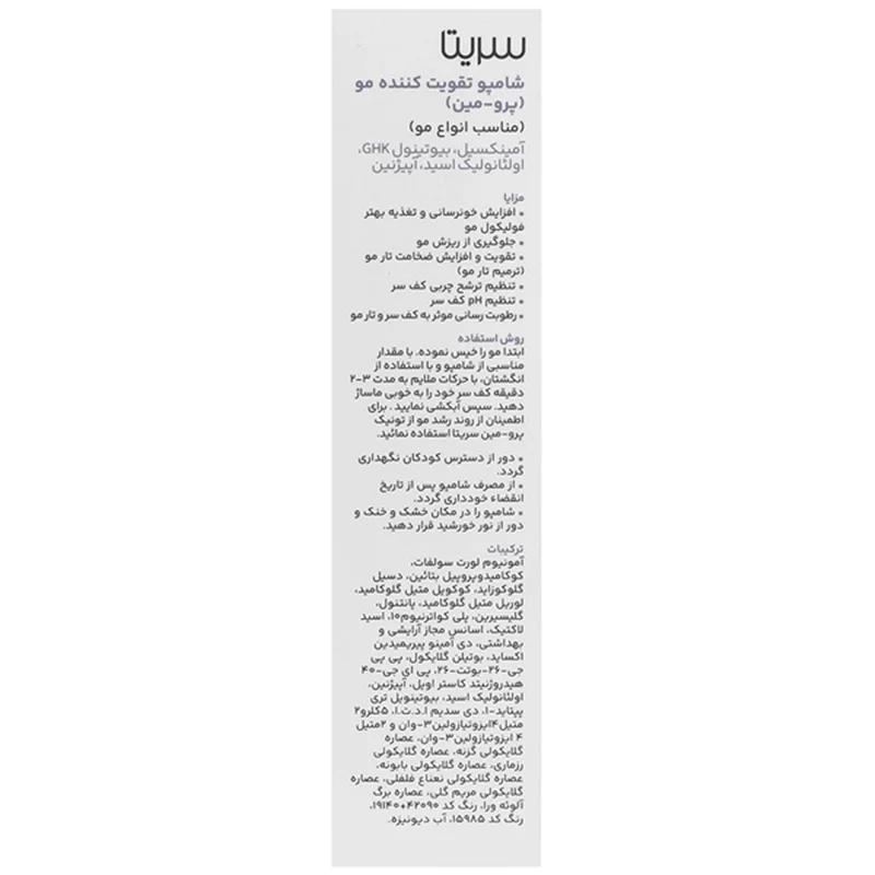 ابتدا موها را خیس نموده و با مقدار لازم از شامپو به مدت 2 تا 3 دقیقه به خوبی ماساژ دهید.سپس، موها را آبکشی نمایید. برای افزایش اثرگذاری شامپو پرومین سریتا، از تونیک پرو-مین سریتا به طور هم زمان استفاده نمایید.