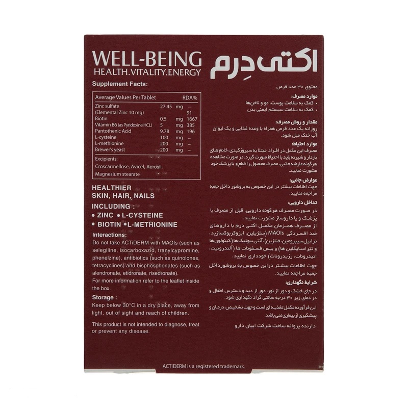 تداخل دارویی: از مصرف همزمان مکمل اکتی درم با داروهای ضد افسردگی MAOIs (سلژیلین، ایزوکربوکسازید، ترانیل سیپرومین، فنلزین)، آنتی بیوتیک ها (کینولون ها و تتراسایکلین ها) و بیس فسفونات ها (آلندرونیت، اتیدرونات، رزیدرونات) خودداری نمایید.