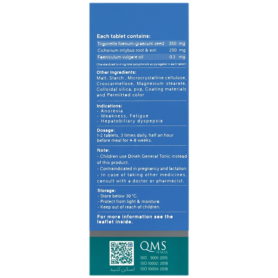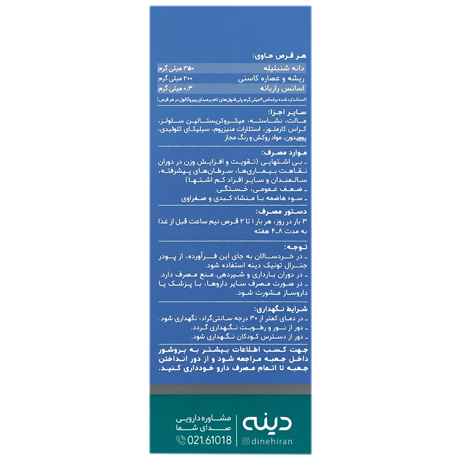 نکات قابل توجه: در خردسالان، به جای قرص شیکوریدین، از پودر جنرال تونیک دینه استفاده شود.