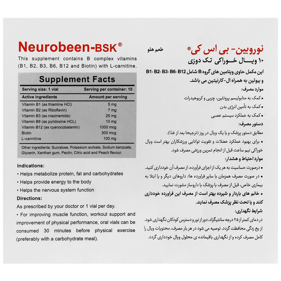 محلول خوراکی نوروبین، ب کمپلکس حاوی 10 ویال خوراکی تامین کننده ویتامین های گروه B (B1، B2، B3، B6، B12 و بیوتین) به همراه ال-کارنیتین