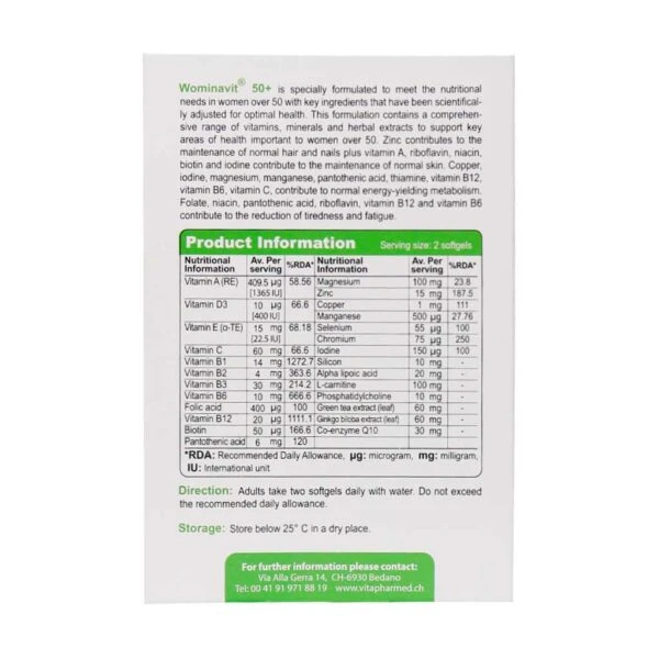 مقدار مصرف کپسول Wominavit+50: روزانه 2 عدد کپسول نرم ژلاتینی