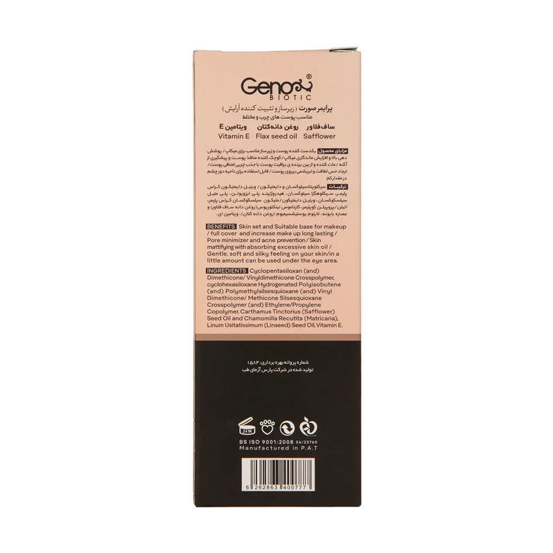 مقدار کمی از پرایمر ژنوبایوتیک را برداشته و آن را با نوک انگشت و با حرکت نرم و چرخشی به طرف بیرون صورت خود بمالید. اجازه دهید پرایمر کاملا خشک شود.