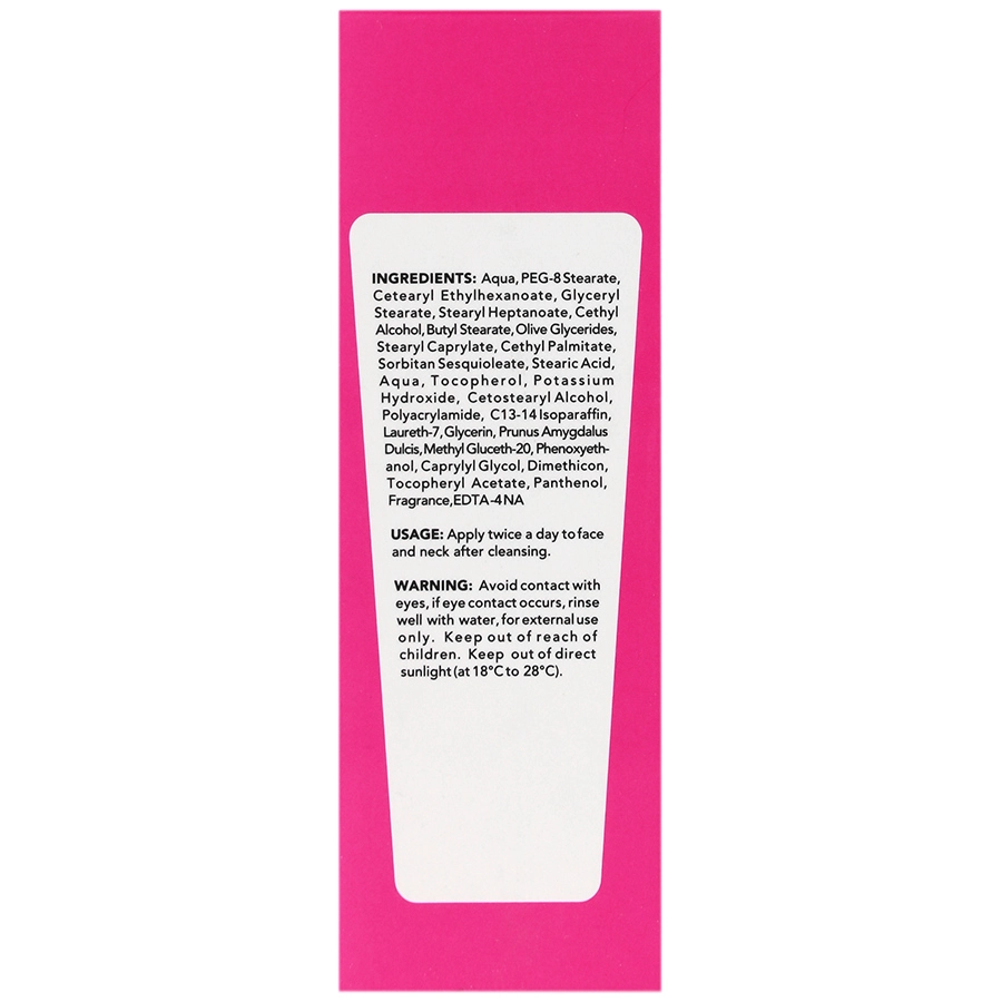 آکوا، پی ای جی-8 استئاره، ستئاریل اتیل هگزانوات، گلیسیریل ستئارات، ستئاریل هپتانوات، ستیل الکل، بوتیل ستئاره، گلیسیرید زیتون، ستئاریل کاپریلات، ستیل پالمیتات، سوربیتان سسکوئی اولئات، ستئاریک اسید، آکوا، توکوفرول، پتاسیم هیدروکسید، ستوستئاریل الکل، پلی آکریل آمید، C13-14 ایزوپارافین، لورت-7، گلیسیرین، روغن بادام، متیل گلوست-20، فنوکسی اتانول، کاپریلیل گلایکول، دایمتیکون، توکوفریل استات، پانتنول، اسانس، ا.د.ت.آ-4سدیم