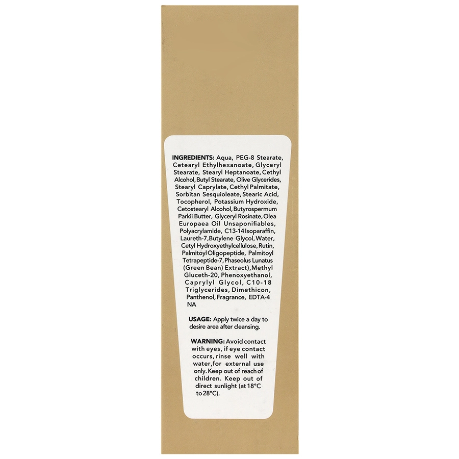 آب (آکوا)، پی ای جی-8 استئارات، ستئاریل اتیل هگزانوات، گلیسریل استئارات، استئاریل هپتانوات، ستیل الکل، بوتیل استئارات، گلیسرید های زیتون، ستئاریل کاپریلات، ستیل پالمیتات، سوربیتان سسکوئی اولئات، استئاریک اسید، توکوفرول، پتاسیم هیدروکسید، ستواستئاریل الکل، شی باتر، گلیسریل رزینات، روغن زیتون اروپایی غیر اشباع، پلی آکریل آمید، C13-14 ایزوپارافین، لورت-7، بوتیلن گلیکول، آب، ستیل هیدروکسی اتیل سلولز، روتین، پالمیتوئیل الیگوپپتید، پالمیتوئیل تتراپپتید-7، عصاره لوبیا سبز، متیل گلوست-20، فنوکسی اتانول، کاپریلیل گلیکول، C10-18 تری گلیسیرید، دایمتیکون، پنتنول، اسانس مجاز آرایشی و بهداشتی، ا.د.ت.آ 4سدیم.