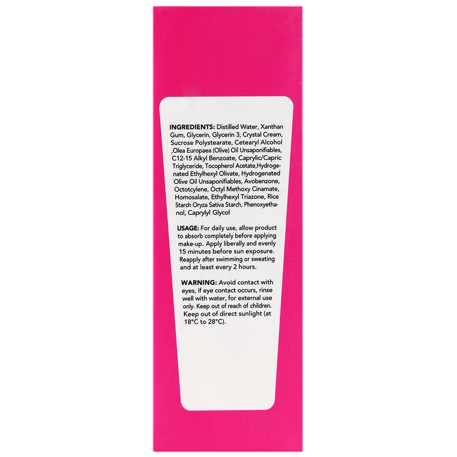 آب مقطر، زانتان گام، گلیسیرین، گلیسیرین 3، کریستال کرم، ساکارز پلی استئارات، ستئاریل الکل، عصاره زیتون غیر صابونی، C12-15 آلکیل بنزوات، کاپریلیک/کاپریک تری گلیسیرید، توکوفریل استات، اتیل هگزیل الیوات هیدروژنه، آووبنزون، اکتوکریلن، اکتیل متوکسی سینامات، هموسالات، اتیل هگزیل تریازون، نشاسته برنج، فنوکسی اتانول، کاپریلیل گلایکول.