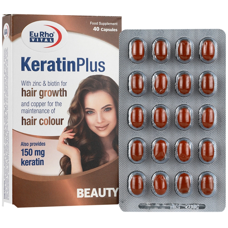 کراتین پلاس یوروویتال حاوی کراتین، روی، بیوتین، مس، فولیک اسید، ویتامین B12 و ویتامین D