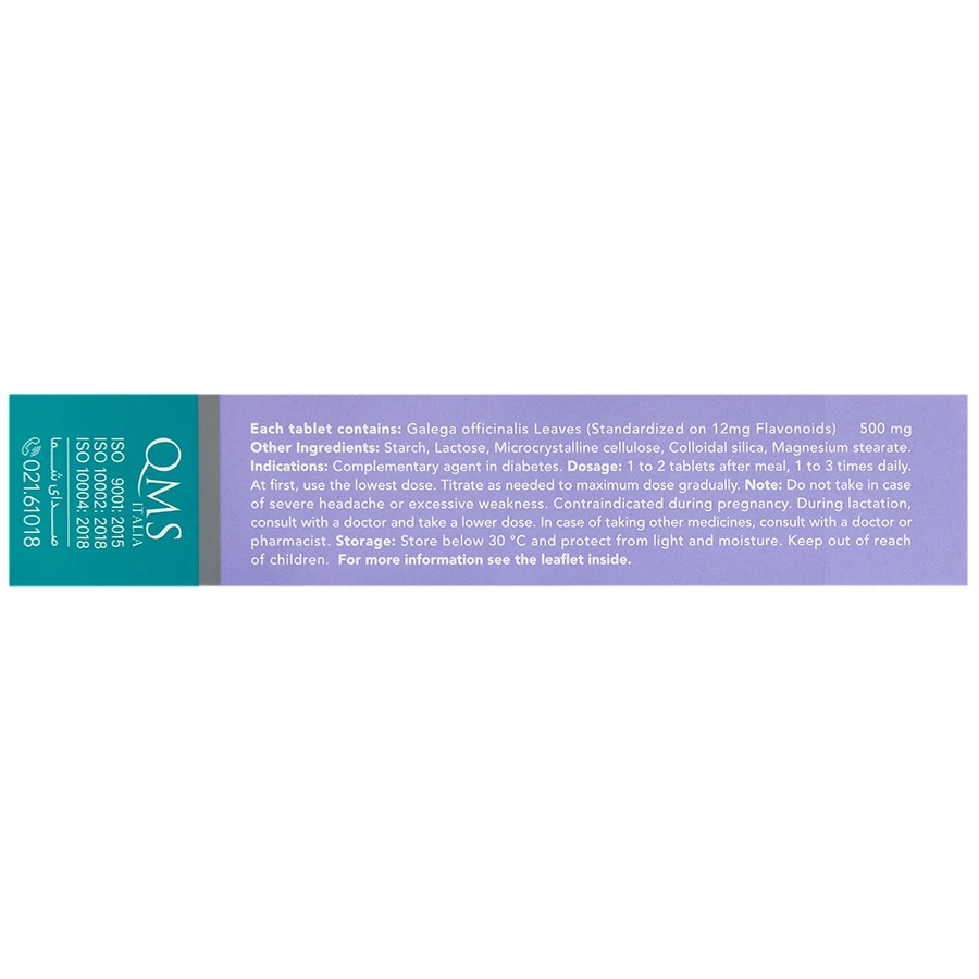 ترکیبات قرص گالگا شامل 500 میلیگرم برگ گالگا به ازای هر قرص است که بر اساس 12 میلیگرم فلاونوئید استاندارد شده است.